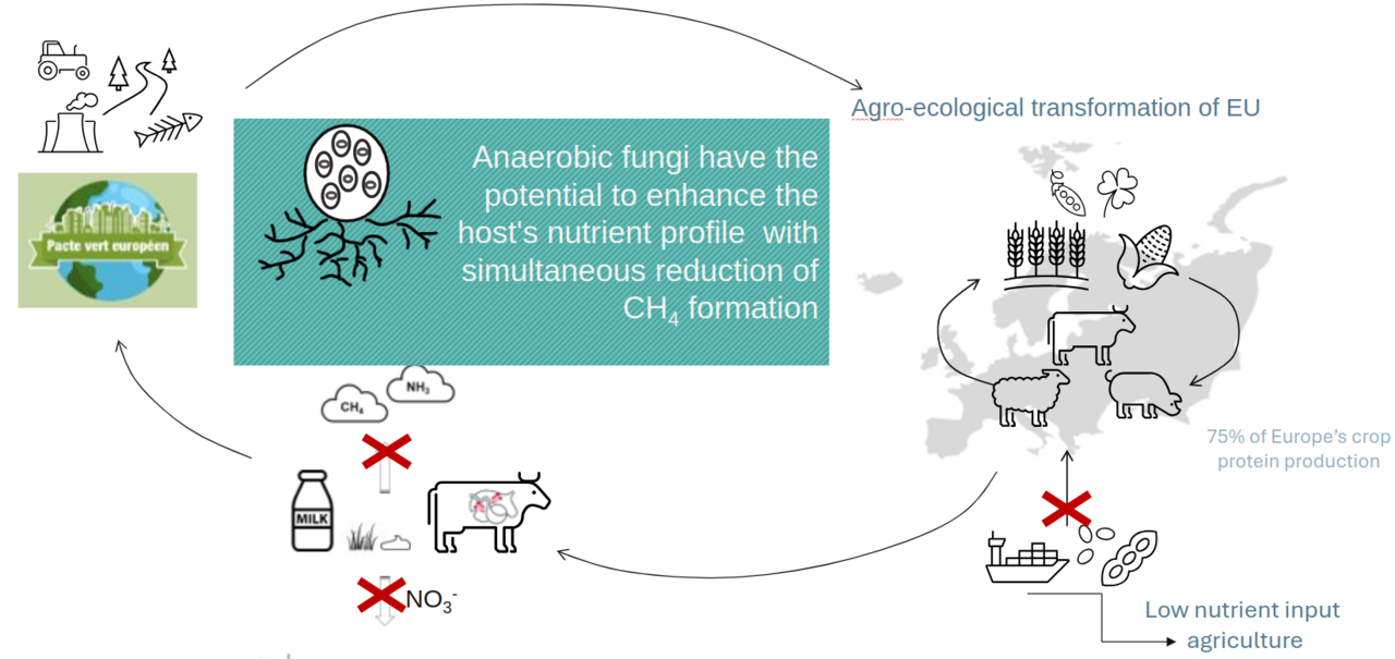 Food systems are responsible for a third of global anthropogenic greenhouse gas emissions, largely contributing to the climate change. Europe´s agro-food system trajectory is characterised by a low efficiency of protein (i.e. nitrogenous) feedstuffs utilization, and significant nitrogen losses to the environment (around 77% of the total nitrogen), causing soil, water and air pollution. Protein is not only the most expensive feed ingredient, and its losses reduce farmers profits, but high-grain diet also leads to rumen dysbiosis, lowering the animal performance. Rumen is the largest component of the ruminant gastrointestinal tract. Hosting a diverse microbiome composed of bacteria, archaea, protists and anaerobic fungi, rumen dynamics is almost solely responsible for nutrient provision to the host. Anaerobic fungi are the least well characterised rumen microbes, even though fungi represent around 20% of the microbial biomass and are considered hidden champions to the efficient cow nitrogen and carbon metabolisms.