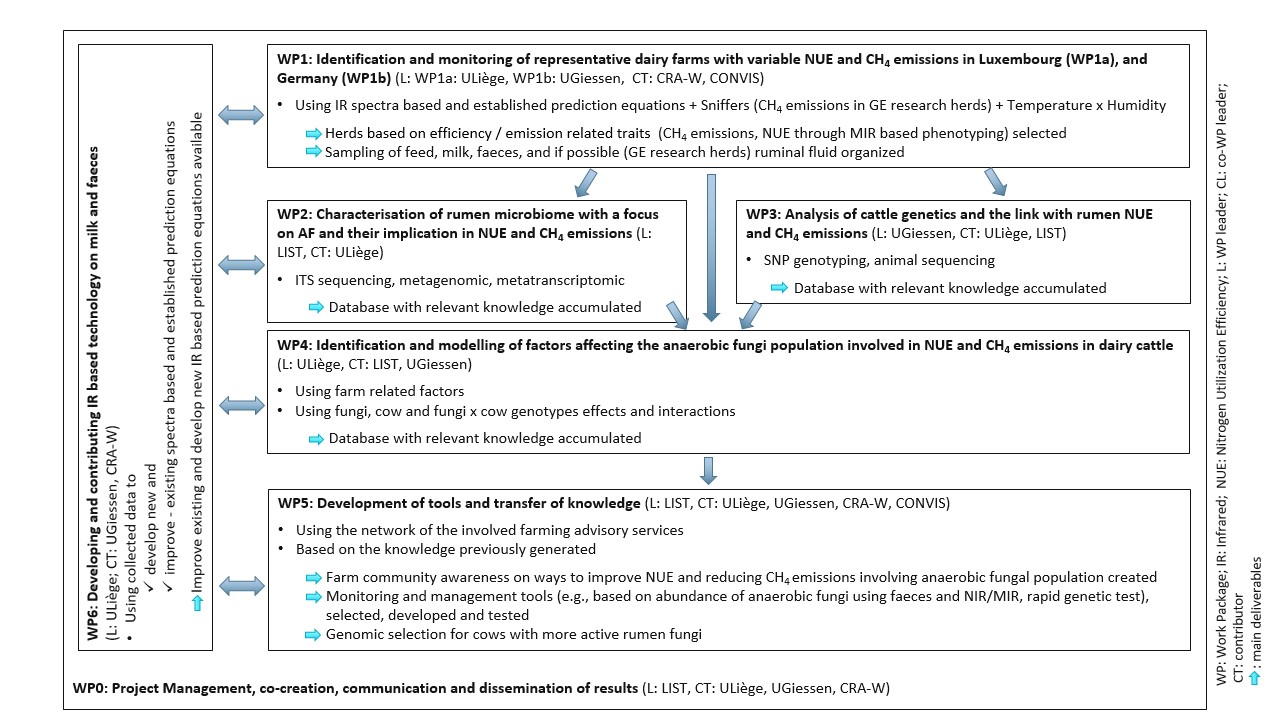 NITMETFUN will transfer knowledge to the farming community in Luxembourg and beyond throughout North-Western Europe, specifically supporting the strong dairy sector in this region. We will develop rapid and non-invasive tools for the assessment of the rumen anaerobic fungi communities. This will be done directly through the molecular analysis of faeces for the presence of fungi. And indirectly, based on improved infrared equations applied to milk, respectively faeces, to predict feed nitrogen utilization efficiency and methane emissions in dairy cows.